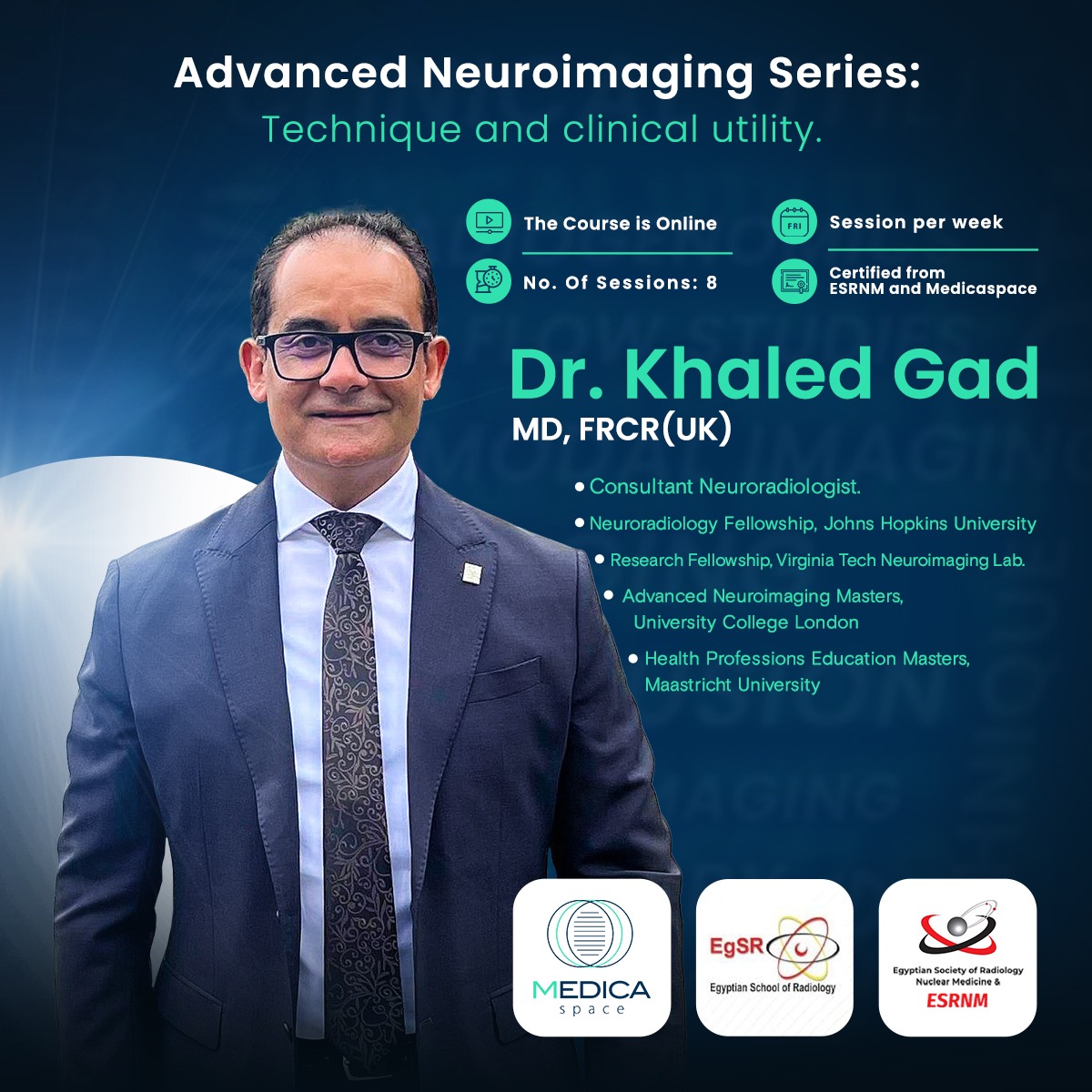 الأستاذ الدكتور: خالد جاد استشارى أشعة المخ والأعصاب بخبرة 15 عامًا بعد الحصول على شهادة الدكتوراة والزمالة البريطانية