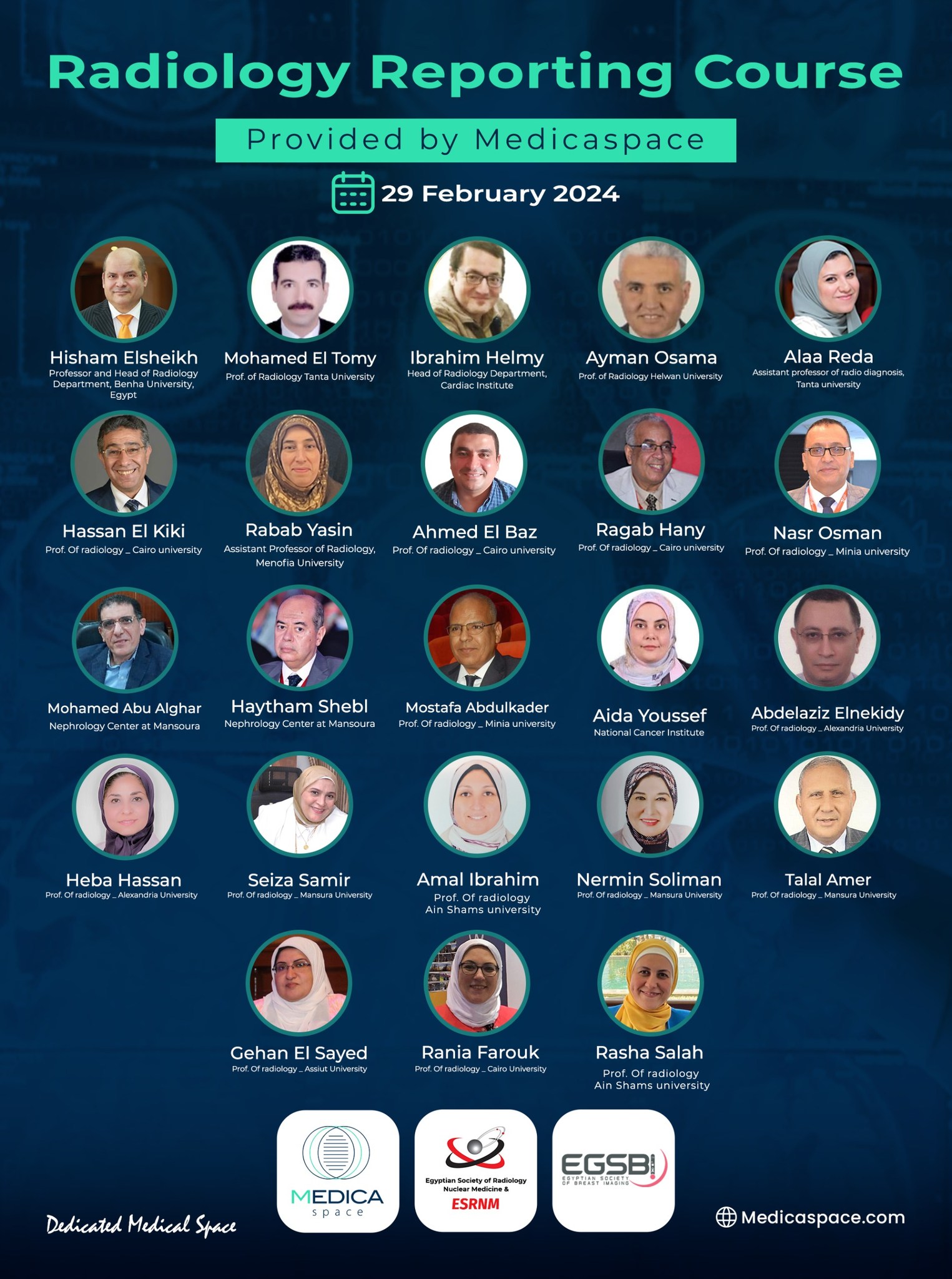 We are thrilled to extend our heartfelt gratitude to everyone who made the Radiology Reporting Course, held from February to June 2024, a resounding success. This course was a collaborative effort by The Egyptian Society of Radiology & Nuclear Medicine (ESRNM) and Egyptian School Of Radiology in cooperation with Medicaspace.
