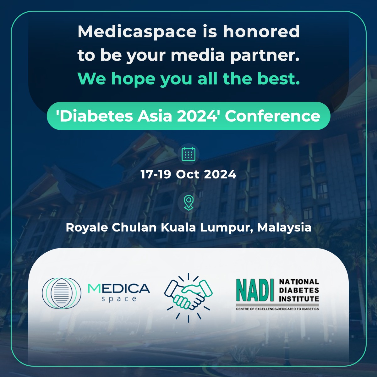 We are thrilled to announce that Medicaspace.com has partnered with the National Diabetes Institute (NADI) for the upcoming Diabetes Asia 2024 Conference, taking place from October 17-19, 2024, at the Royale Chulan Kuala Lumpur, Malaysia.